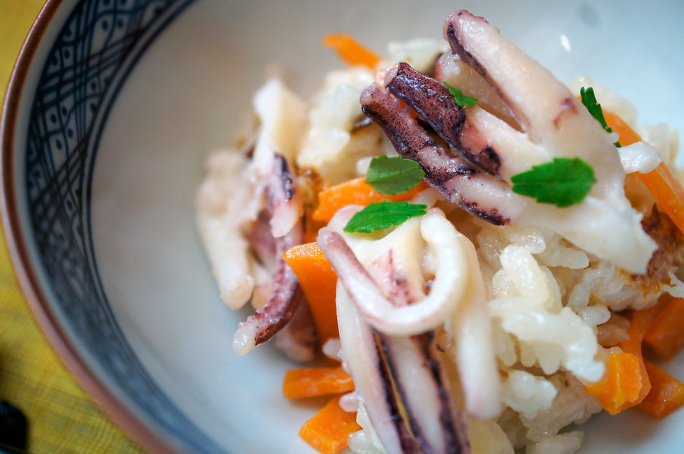 旬のイカとビタミンたっぷりの人参を炊き込んだ、牛乳炊き込みご飯♪